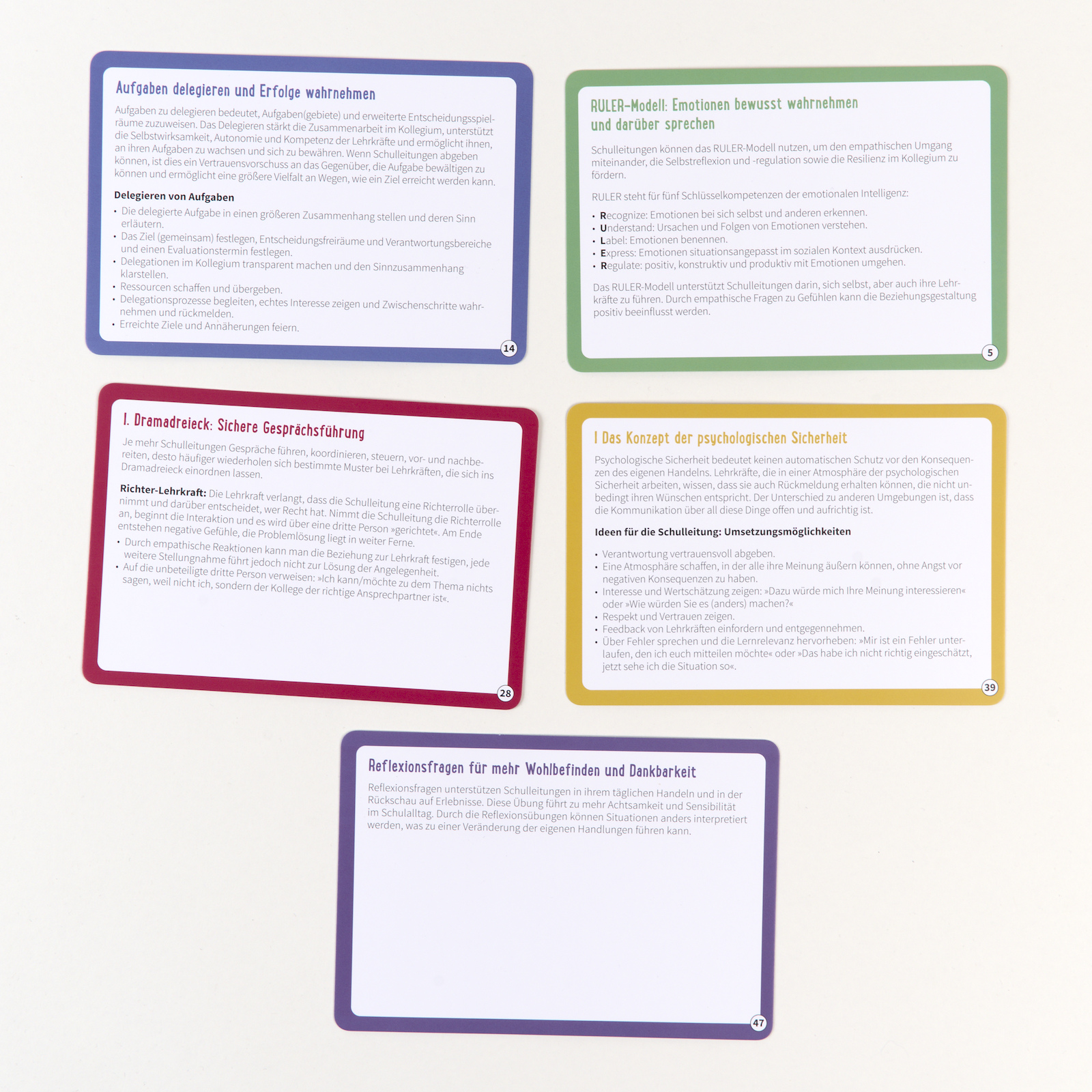 Dieses Kartenset bietet Ihnen 50 wissenschaftlich fundierte Impulse aus der Positiven Psychologie mit praktischen Führungstipps, die Sie direkt im Schulalltag anwenden können. Ob es um stärkenorientierte Führung, wertschätzende Kommunikation oder die Förderung von Resilienz geht – jede Karte liefert Ihnen praxisnahe Anregungen, um Ihr Kollegium nachhaltig zu stärken, die Ressourcen des Kollegiums gewinnbringend zu nutzen und die Freude am Unterrichten und Gestalten anzukurbeln.