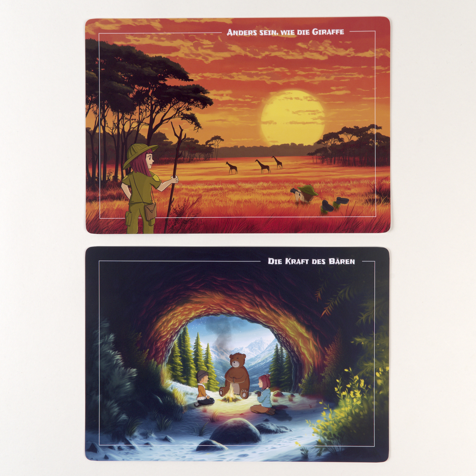 Michael Burtschers kindgerechte Illustrationen kommen im A4-Format besonders zur Geltung und die Karten können auch in Gruppen gezeigt werden. Sie bieten vielfältige Anlässe, um mit Kindern ins Gespräch zu kommen und gemeinsam zu entspannen.