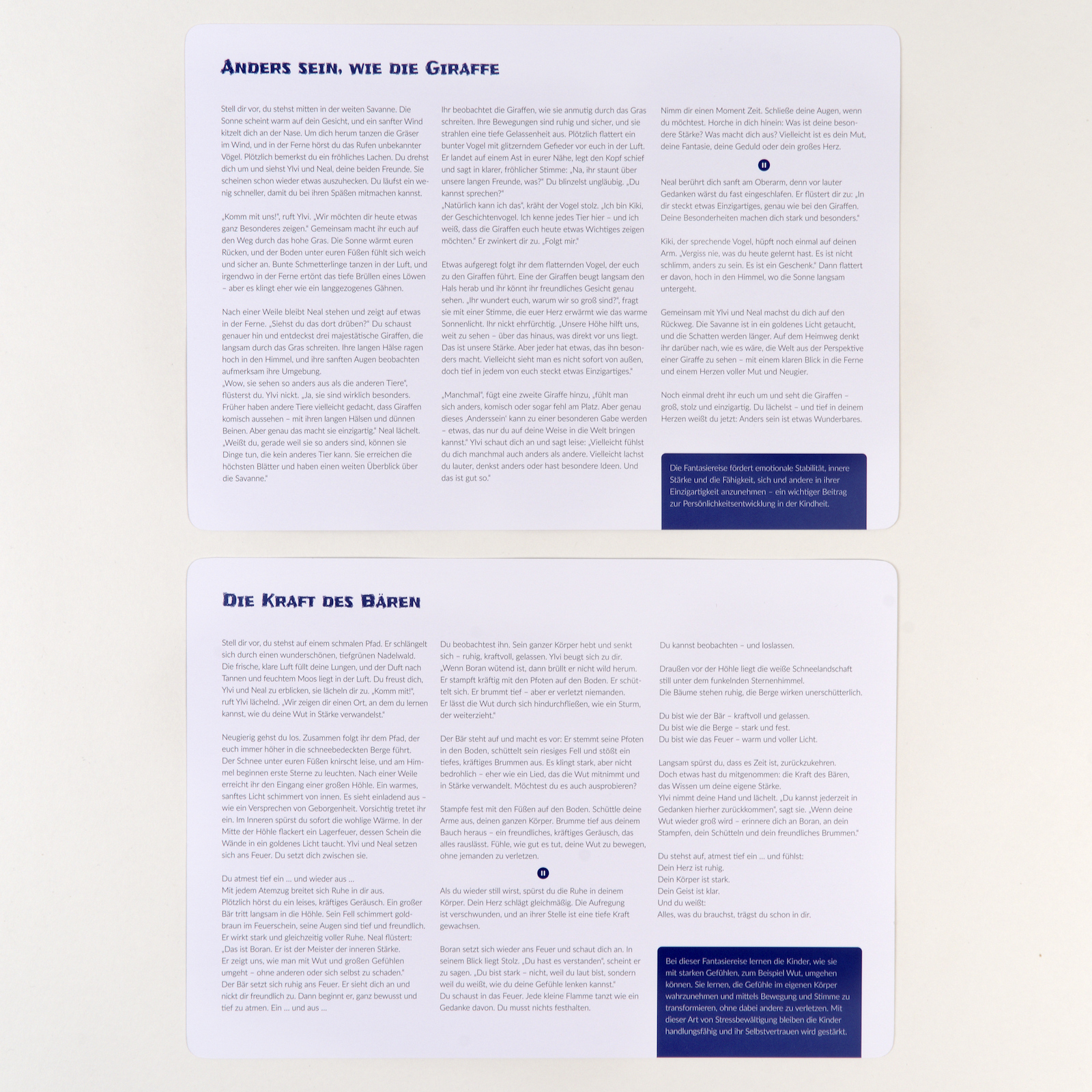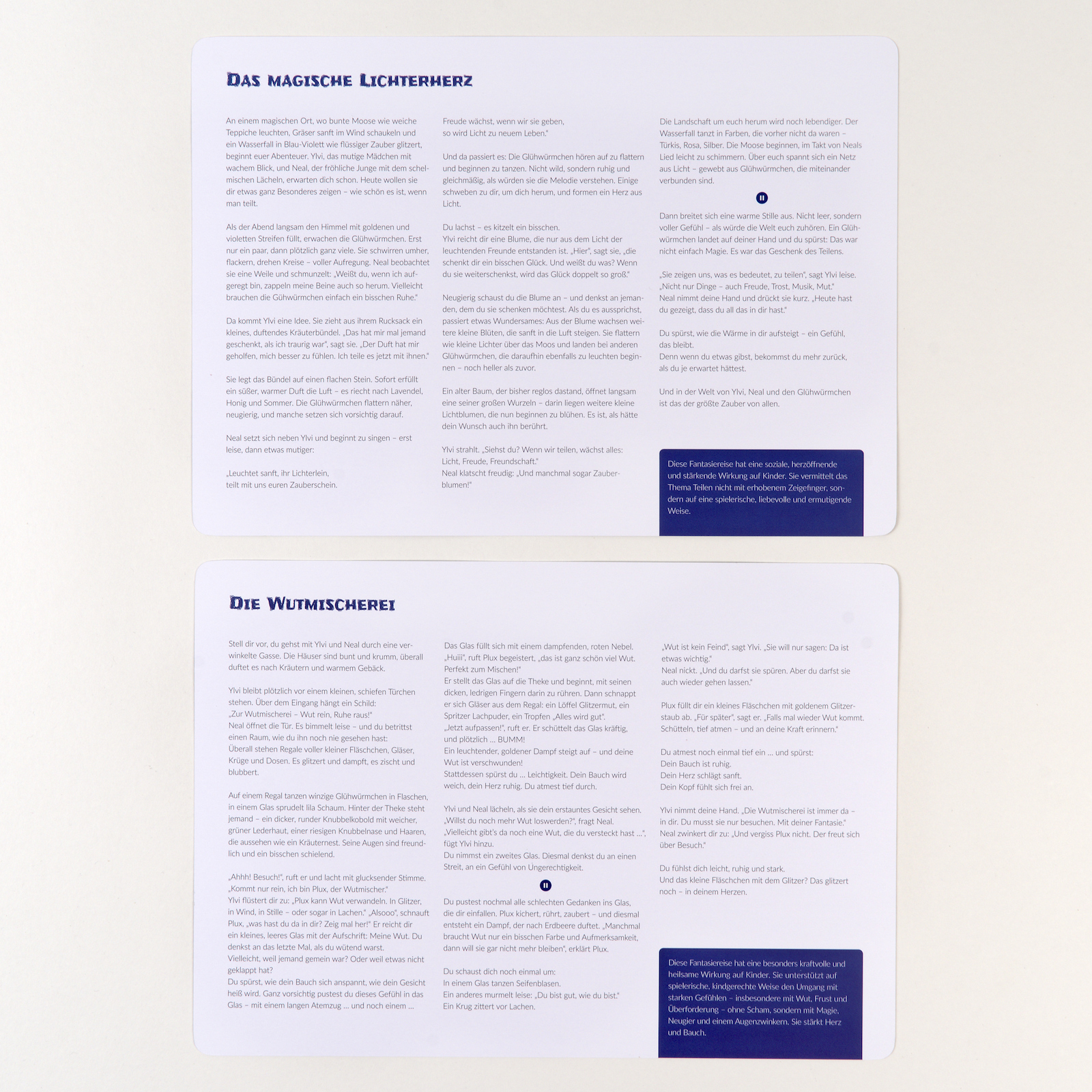 Das Kartenset verbindet detailreiche, fantastische Bilder mit Geschichten: Die Vorderseite jeder Karte zeigt eine ansprechende, großflächige Illustration. Auf der Rückseite findet sich die passende Fantasiereise zum Vorlesen. Eine Einstimmungs und eine Ausklangkarte runden das Set ab.