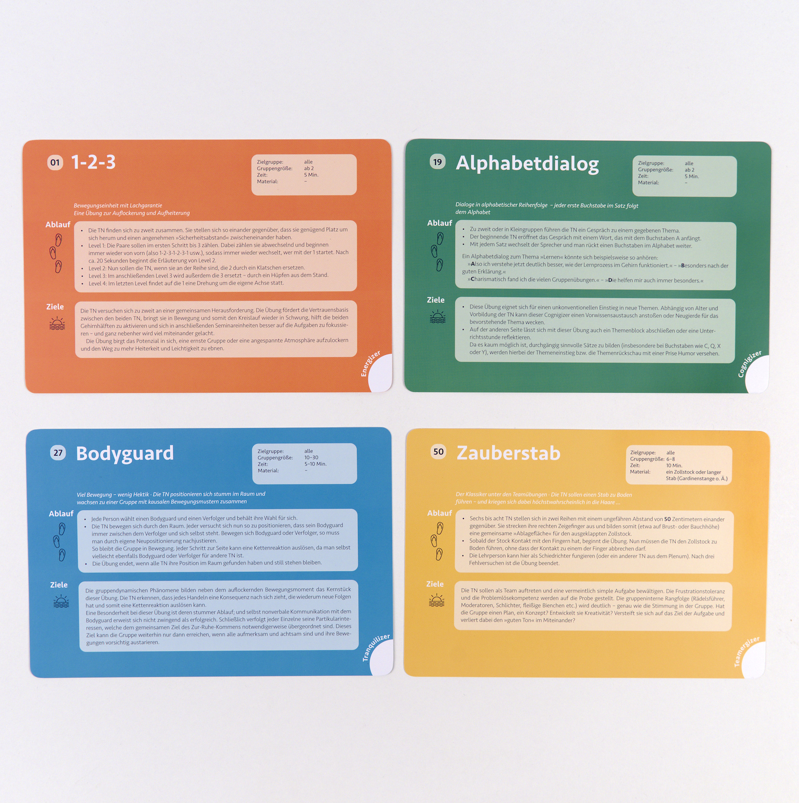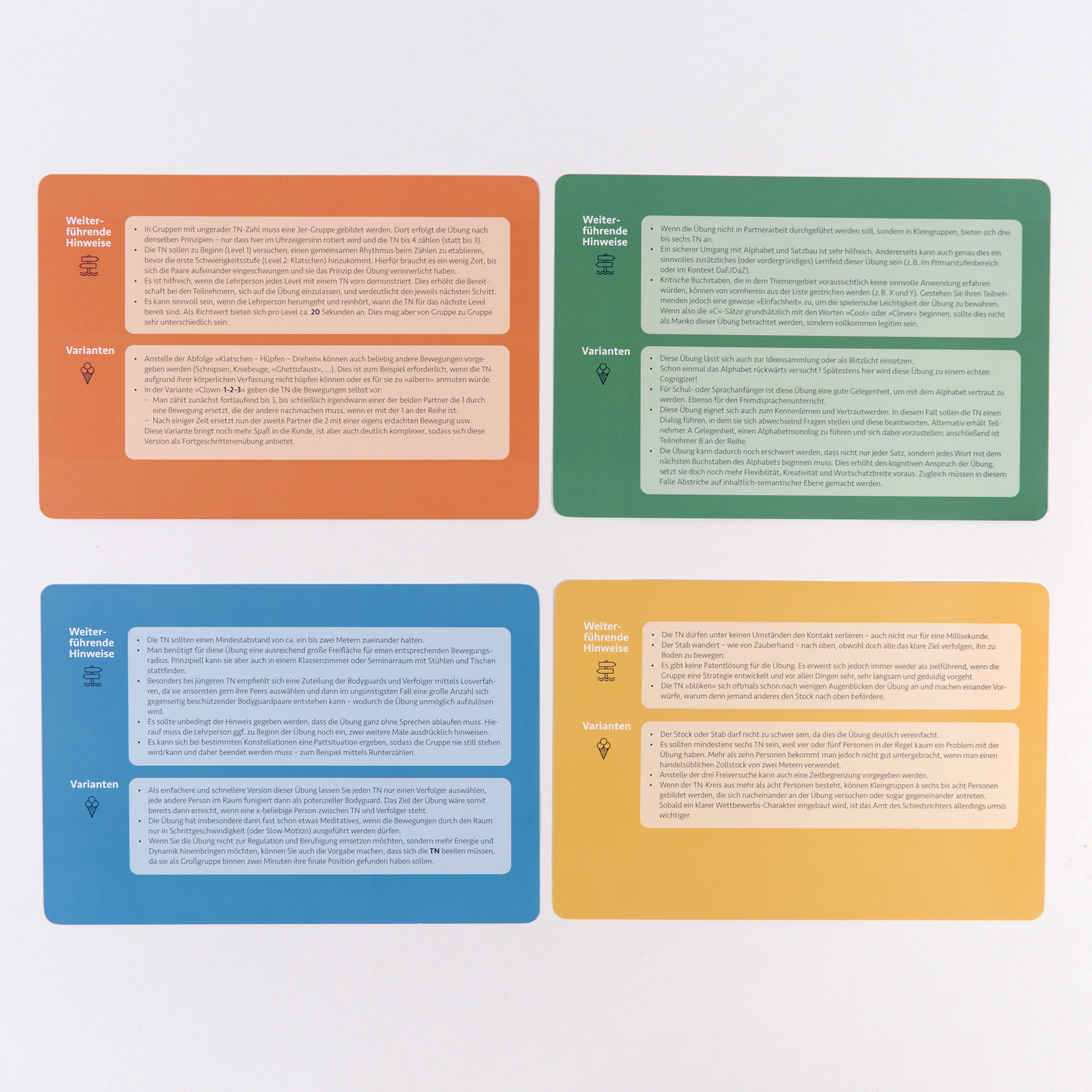 Dieses Kartenset umfasst 50 Übungen, die sich in den Phasenrhythmus von Unterricht oder Seminaren beweglich einfügen und dabei unterstützen, die Aufmerksamkeit der Teilnehmenden zu gewinnen. Vor, während und nach lernintensiven Phasen bieten sich diese Methoden-Häppchen an, um die Konzentration zu erneuern, Anspannung zu lösen, kleinere Bewegungseinheiten und kognitive Pausen zu ermöglichen. Außerdem sind teambildende Übungen integriert. Auf jeder Karte sind übersichtlich Empfehlungen zu Alter, Gruppengröße, Zeit, Material und Hintergründen wie Ziele, Tipps und Varianten auch visuell dargestellt und ermöglichen eine einfache Umsetzung. Das Booklet bietet weitere Informationen und Hinweise.