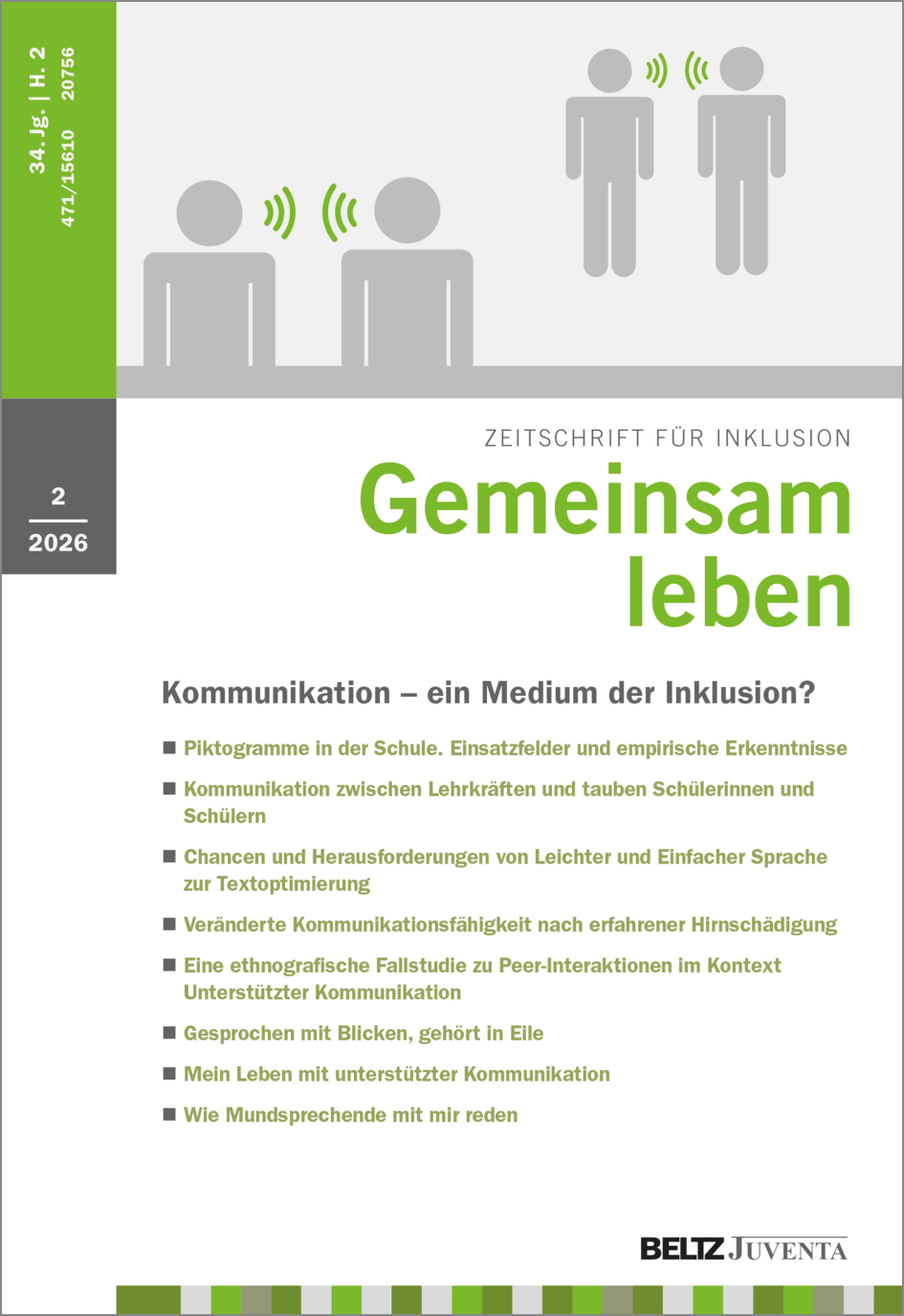 Die Zeitschrift Gemeinsam Leben ist in den 1990er Jahren aus dem gemeinsamen Engagement von Wissenschaftler:innen, Angehörigen von Menschen mit Behinderung und Praktiker:innen für eine inklusive Gesellschaft hervorgegangen. In dieser Tradition versteht sie sich auch heute als kritische Beobachterin gesellschaftlicher, politischer und fachlicher Entwicklungen. Betroffene, Eltern, Angehörige, Fachleute aus Wissenschaft und Praxis finden in Gemeinsam Leben aktuelle Fachinformationen und ein lebendiges Diskussionsforum zu unterschiedlichsten Fragen der Umsetzung von Inklusion. Die gemeinsame Bildung und Erziehung von Kindern und Jugendlichen mit und ohne Behinderung sowie die Stärkung gleichberechtigter und selbstbestimmter Teilhabe aller Menschen sehen die Herausgeber:innen als unverzichtbaren Bestandteil eines inklusiven Gemeinwesens an.