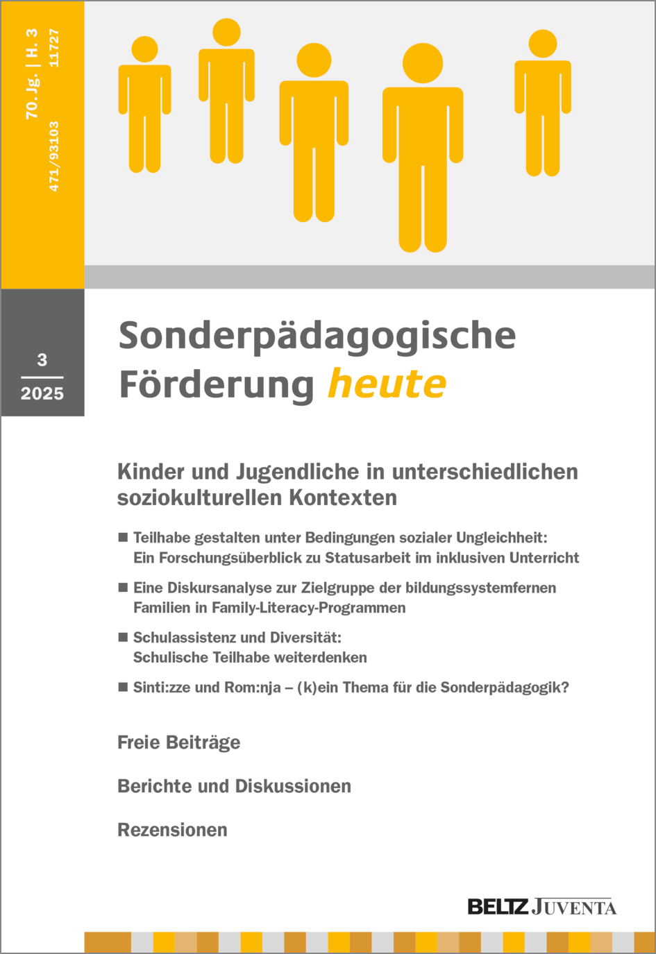 Sonderpädagogische Förderung heute ist ein Forum der Fachdiskussion in Wissenschaft und Praxis, das sich der pädagogischen Rehabilitation in der gesamten Lebensspanne widmet. Ein besonderer Akzent liegt dabei auf Fragen der Teilhabe und Inklusion.
