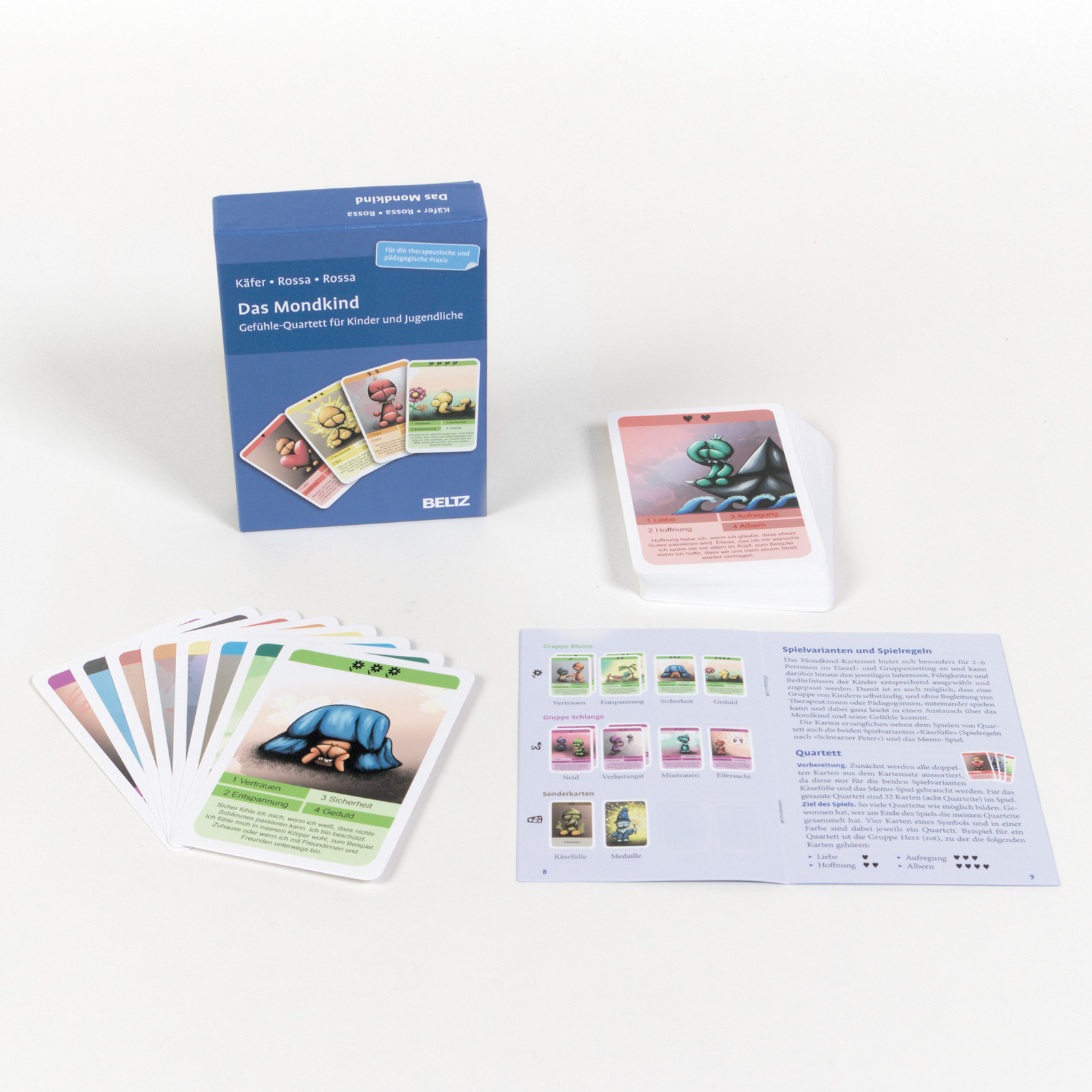 Mit 50 Spielkarten können sich Kinder und Jugendliche spielerisch über ihre eigene Gefühlswelt austauschen und sie intensiv erforschen. Stets dabei das Mondkind, das auf den Karten jede Menge Emotionen erlebt und sie aus der eigenen Sicht beschreibt. So können Worte für eigene Gefühle gefunden und damit verbundene Situationen beschrieben werden. Damit es spannend bleibt, bietet das Kartenset zwei weitere Spielvarianten: »Käsefüße« und Memo.
