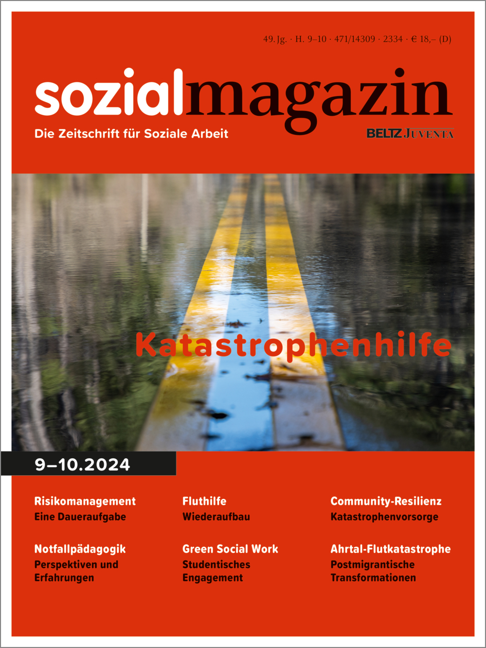 Die Ahrtal-Flutkatastrophe aus dem Sommer 2021 hält mit ihren Folgen bis heute an. Auch die Überschwemmungen im Saarland, in Bayern und in Baden-Württemberg im Sommer 2024 zeigen erneut: Extremwetterereignisse nehmen nicht nur weltweit, sondern auch hierzulande zu, und betreffen Adressat:innen der Sozialen Arbeit in besonders massiver Weise. Hinzu kommen weitere Katastrophen wie Kriege, die mit klimabedingten Katastrophen interagieren, und nach sozialarbeiterischen Antworten verlangen. Ein sozialarbeiterischer Zugang zur Katastrophenhilfe ist in verschiedenen Ländern der Welt bereits etabliert, steckt im deutschsprachigen Raum aber noch in den Kinderschuhen. Dieses Heft führt die Debatten der Sozialen Arbeit und Katastrophenhilfe zusammen und setzt sich mit einem bisher marginalisierten, aber drängenden Thema auseinander.