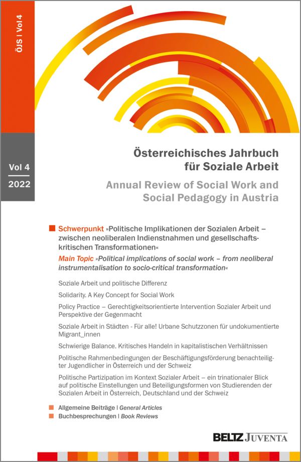 ÖJS | Soziale Arbeit | Österreich | Soziale Arbeit Österreich | Österreichisches Jahrbuch für Soziale Arbeit | gesellschaftskritische Transformationen | politische Soziale Arbeit | politische Theoriebildung Soziale Arbeit | Demokratisierung | Urban Citizenship | Sanctuary Cities | illegale Einwanderung | Migration | Flucht | undokumentierte Menschen | Menschenrechte | illegalisierte Menschen | Jugendarbeitslosigkeit | politische Partizipation | politische Partizipation Studierender der Sozialen Arbeit | digitale Transformationen | Macht | Social Justice | Digitalisierung