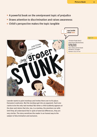 Christian Duda (text) / Julia Friese (illustrations)Gro%u00dfer StunkThe Big StinkFour-colour picture bookHardover, 54 pagesFormat: 21,5 x 21 cmPicture Book 19%u25cf A powerful book on the omnipresent topic of prejudice%u25cf Draws attention to discrimination and raises awareness%u25cf Child's perspective makes the topic tangibleAge: 5+Leander wants to paint monkeys and invites them over to his place. Everyone is welcome. But the monkeys get into an argument. Each one claims to be the only real monkey! But when a child suddenly appears at the door and claims that she, too, is a monkey, the emotions run wild. Until they all understand that in spite of external differences, they are very similar. The story sensitizes the reader in an honest way to the subject of discrimination and exclusion.see inside click here