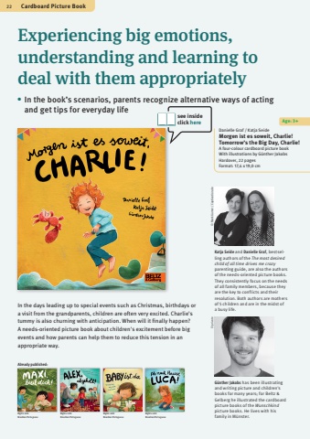 Cardboard Picture Book 22%u25cf In the book%u2019s scenarios, parents recognize alternative ways of acting and get tips for everyday lifeIn the days leading up to special events such as Christmas, birthdays or a visit from the grandparents, children are often very excited. Charlie's tummy is also churning with anticipation. When will it finally happen? A needs-oriented picture book about children's excitement before big events and how parents can help them to reduce this tension in an appropriate way.Danielle Graf / Katja SeideMorgen ist es soweit, Charlie!Tomorrow%u2019s the Big Day, Charlie!A four-colour cardboard picture bookWith illustrations by G%u00fcnther JakobsHardover, 22 pagesFormat: 17,4 x 19,0 cmExperiencing big emotions, understanding and learning to deal with them appropriatelyAge: 3+ G%u00fcnther Jakobs has been illustrating and writing picture and children's books for many years; for Beltz & Gelberg he illustrated the cardboard picture books of the Wunschkindpicture books. He lives with his family in M%u00fcnster.%u00a9 privateAlready published:%u00a9 Mark Garner / Captivation.deKatja Seide and Danielle Graf, bestselling authors of the The most desired child of all time drives me crazyparenting guide, are also the authors of the needs-oriented picture books. They consistently focus on the needs of all family members, because they are the key to conflicts and their resolution. Both authors are mothers of 5 children and are in the midst of a busy life.Rights sold:Brasilian PortugueseRights sold:Brasilian PortugueseRights sold:Brasilian PortugueseRights sold:Brasilian Portuguesesee inside click here