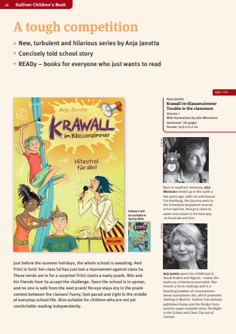 Gulliver Children's Book%u00a9 Daniel Treplin26Anja Janotta spent her childhood in Saudi Arabia and Algeria %u2013 today she works as a freelance journalist. She travels a lot to readings and is a founding member of %u00bbIsarautoren%u00ab (www.isarautoren.de), which promotes reading in Munich. Gulliver has already published Fanny and the Perfect Fairyand the super readable titles The Night in the School and Class Trip out of Control.%u25cf New, turbulent and hilarious series by Anja Janotta%u25cf Concisely told school story%u25cf READy %u2013 books for everyone who just wants to read Just before the summer holidays, the whole school is sweating. And Fritzi is livid: her class 5d has just lost a tournament against class 5a. Those nerds are in for a surprise! Fritzi starts a nasty prank. Nils and his friends from 5a accept the challenge. Soon the school is in uproar, and no one is safe from the next prank! No eye stays dry in the prank contest between the classes! Funny, fast-paced and right in the middle of everyday school life. Also suitable for children who are not yet comfortable reading independently.Anja JanottaKrawall im KlassenzimmerTrouble in the classroomVolume 1With illustrations by Julia WeinmannHardcover: 135 pagesFormat: 14,9 x 21,2 cmA tough competitionAge: 10+ %u00a9 privateBorn in southern Germany, Julia Weinmann ended up in the north a few years ago, with cat and mouse. Via Hamburg, the journey went to the Schaalsee biosphere reserve. In her opinion, being so close to water and nature is the best way to illustrate and live.Volume 2 will be available in Spring 2026: