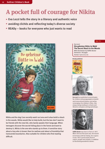 Gulliver Children's Book 28Eva Lezzi has published several books for children and young people on Jewish and transcultural themes and writes screenplays for children's films. She enjoys doing reading in schools and libraries and gives writing workshops.St%u00e9ffie Becker was born in Paris in 1977. When she was five years old, she moved to Germany with her family, her crayons in tow. She is particularly fond of nature, people and animals, in addition to illustrating wonderful stories.%u25cf Eva Lezzi tells the story in a literary and authentic voice%u25cf avoiding clich%u00e9s and reflecting today's diverse society%u25cf READy %u2013 books for everyone who just wants to readNikita and the dog Cara secretly watch as Lena and Lukas build a shack in the woods. Nikita would like to help build, but the two don't want to be friends with the new kid, who barely speaks their language. When teenagers discover the secret hiding place in the forest and want to destroy it, Nikita is the one who stands up to them. A sensitive story about a boy who is braver than he realises and about a friendship that transcends boundaries. Also suitable for children who find reading difficult.Eva LezziDie geheime H%u00fctte im WaldThe Secret Shack in the WoodsWith illustrations by St%u00e9ffie BeckerHardcover: 119 pagesFormat: 14,9 x 21,2 cmA pocket full of courage for NikitaAge: 9+ %u00a9 Eva Linder %u00a9 Alex LippAlready published: