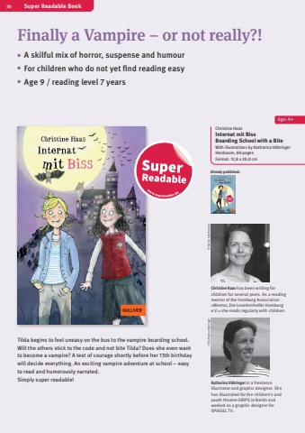 Already published:Super Readable Book%u00a9 Katharina V%u00f6hringer30Christine Haas has been writing for children for several years. As a reading mentor of the Hamburg Association %u00bbMentor, Die Leselernhelfer Hamburg e.V.%u00ab she reads regularly with children.Katharina V%u00f6hringer is a freelance illustrator and graphic designer. She has illustrated for the children's and youth theatre GRIPS in Berlin and worked as a graphic designer for SPIEGEL TV.%u25cf A skilful mix of horror, suspense and humour%u25cf For children who do not yet find reading easy%u25cf Age 9 / reading level 7 yearsTilda begins to feel uneasy on the bus to the vampire boarding school. Will the others stick to the code and not bite Tilda? Does she even want to become a vampire? A test of courage shortly before her 13th birthday will decide everything. An exciting vampire adventure at school %u2013 easy to read and humorously narrated. Simply super readable!Christine HaasInternat mit BissBoarding School with a BiteWith illustrations by Katharina V%u00f6hringerHardcover, 80 pagesFormat: 12,8 x 20,0 cmFinally a Vampire %u2013 or not really?!Age: 9+ %u00a9 Karina Sherbakova