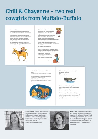 %u00a9 privateKatalina Brause, born in 1973, grew up in East Westphalia and studied law in Germany, England and France. She lives with her family (husband, two children and many carnivorous plants) in Cologne. http://katalinabrause.de/ %u00a9 privateAriane Camus grew up near Bordeaux. She studied French literature and taught art in prisons. She has lived in Hamburg since 2006. She works as an illustrator for magazines and publishing houses. She prefers to draw for children %u2013 including her own three.238 39mit ihren H%u00e4nden dr%u00fcber. Damit die Aufkleber gut halten. Jetzt k%u00f6nnen sie alle 101 Rinder abz%u00e4hlen. %u2013 Juchhu! Die M%u00e4dchen machen ein Lagerfeuer. Bald duftet es nach Maiskolben. Und Gras und Fell. Hufi und Schnaubelt stehen dicht bei den Freundinnen. Niemand ist da. Au%u00dfer Chili und Chayenne und den Tieren. Oder?Da knackt es. Chayenne zuckt zusammen. %u201eKommt jetzt der Dieb?%u201c, fl%u00fcstert sie. Puh! %u2013Es ist nur ein Waschb%u00e4r. Da! %u2013 Etwas heult. Ganz schaurig heult es. %u201eHast du das auch geh%u00f6rt?%u201c, fragt Chili. Ihre Stimme piepst. %u201eIch habe Angst%u201c, wispert Chayenne.Es heult wieder. %u201eDie Geister!%u201c, fl%u00fcstert Chili. %u201eMan sagt, hier g%u00e4be es Geister%u201c. Chili, die sonst immer mutig ist, greift nach Chayennes Hand. Chayenne dr%u00fcckt sie fest. Mit jedem Dr%u00fccken wird Chili wieder mutiger. Und Chayenne auch. 8 9Da ist sie ja, Chili. Eigentlich hei%u00dft sie Carlotta. Weil sie so rote Haare hat, die an die Farbe einer Chilischote erinnern, nennen sie alle nur %u2026 Chili. Chili hat eine L%u00fccke zwischen den Schneidez%u00e4hnen. Durch die kann sie prima Sonnenblumenkerne spucken. Und pfeifen, lauter als alle Jungs in der Schule. Als Cowgirl k%u00f6nnte Chili das gut brauchen. Denn Cowgirl %u2013 das w%u00e4re sie nur zu gerne! Gemeinsam mit Schnaubelt, ihrem Pferd, w%u00fcrde sie die Herde zusammenhalten. Die Tiere besch%u00fctzen. Darauf achten, dass kein Wolf kommt. Oder ein Dieb. Chili wei%u00df genau: Den w%u00fcrde sie sofort vertreiben mit ihrer Wasserpistole. Die hat sie immer dabei. Und sie trifft immer %u2013 na ja, fast immer %u2026Doch in dem kleinen %u00d6rtchen M%u00fcffel-B%u00fcffel gibt es nur Cowboys %u2013 also Erwachsene, M%u00e4nner, die sich um die Herde k%u00fcmmern. Keine Kinder und erst recht keine M%u00e4dchen. Da kann man nichts machen, oder?Der hier mit der goldenen Taschenuhr ist Old Amsterdam, der B%u00fcrgermeister. Er ist der Bestimmer in M%u00fcffel-B%u00fcffel. Ihr werdet ihn noch kennenlernen. Wenn es in M%u00fcffel-B%u00fcffel von irgendwoher kichert, dann ist das bestimmt Chayenne. Chayenne ist Chilis beste Freundin und eine richtig verkicherte Kichererbse. Eigentlich ist sie ja ein bisschen sch%u00fcchtern. Sie kichert am liebsten mit Chili. Und was man noch mit der besten Freundin so tut: in der Schule Chili & Chayenne %u2013 two real cowgirls from Muffalo-Buffalo