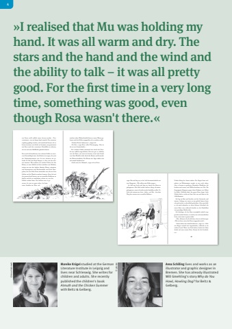 %u00a9 Arne VollstedtMareike Kr%u00fcgel studied at the German Literature Institute in Leipzig and lives near Schleswig. She writes for children and adults. She recently published the children's book Almuth and the Chicken Summerwith Beltz & Gelberg. %u00a9 privateAnna Schilling lives and works as an illustrator and graphic designer in Bremen. She has already illustrated Will Gmehling's story Why do You Howl, Howling Dog? for Beltz & Gelberg.462 63Nachts klang der Sturm anders. Der Regen hatte aufgeh%u00f6rt, im Wohnzimmer tropfte es nur noch selten, aber es kamen in gr%u00f6%u00dferen Abst%u00e4nden Windb%u00f6en, die heulten und tosten, und Wellen krachten ans Ufer. Die Eingangst%u00fcr klapperte gegen ihren Rahmen wie Z%u00e4hne bei K%u00e4lte. Vielleicht hatte das ganze Haus Angst. Auch Zibebe hielt es nicht auf dem Sofa aus und kam in die Schlafkammer.Ich lag im Bett und horchte auf die Ger%u00e4usche und zitterte. Solange wir etwas zu tun gehabt hatten, hatte ich mich nicht so schrecklich gef%u00fcrchtet. Aber jetzt f%u00fchlte ich mich schutzlos, in dieser kleinen Schachtel, die unser Haus war, w%u00e4hrend drau%u00dfen in der Dunkelheit eine gewaltige Macht tobte.Ich %u00fcberlegte, ob das Haus wom%u00f6glich einfach weggeweht werden k%u00f6nnte, es stand ja nur auf einem flachen Stein, wenn man es genau nahm. %u00bbMu%u00ab, fl%u00fcsterte ich, als ich h%u00f6rte, dass sie sich bewegte. %u00bbWas ist denn, wenn das Haus weggeweht wird?%u00ab%u00bbDann ziehen wir nach Herzhausen%u00ab, sagte sie. %u00bbOder wir fliegen einfach mit. Irgendwohin, vielleicht in ein anderes Land. Wenn wir Pech haben, landet das Haus direkt auf einer armen Hexe. Kennst du die Geschichte?%u00absagte Mu und fing an, in der Luft herumzufuchteln wie eine Dirigentin. %u00bbWir sollten eine Polka wagen.%u00abSie half mir hoch und fing an, durch das Haus zu galoppieren. Mir blieb nichts anderes %u00fcbrig, als mitzugaloppieren, wenn ich nicht wieder hinfallen wollte. Zibebe stob entsetzt zur Seite. %u00bbJuhu%u00ab, rief Mu. %u00bbAus dem Weg, hier tanzen zwei verr%u00fcckte H%u00fchner.%u00ab%u00bbI realised that Mu was holding my hand. It was all warm and dry. The stars and the hand and the wind and the ability to talk %u2013 it was all pretty good. For the first time in a very long time, something was good, even though Rosa wasn't there.%u00ab 46 47tauchen sehen. Wahrscheinlich hatte er unter Wasser gelauert und das Fohlen angegriffen, als es trinken wollte.%u00bbTrinken Pferde Salzwasser?%u00ab, fragte ich.%u00bbNa klar%u00ab, sagte Rosa voller %u00dcberzeugung. %u00bbDas ist f%u00fcr sie wie Gem%u00fcsebr%u00fche.%u00abDas verletzte Fohlen schnaufte leise durch die Nase. Es war endlich eingeschlafen. Das war gut so, schlafen war das Beste, was man tun konnte, wenn man krank war. Eine Windb%u00f6e fuhr durch die B%u00e4ume und kr%u00e4uselte die Wasseroberfl%u00e4che. Die W%u00e4rme des Tages f%u00fchlte sich auf einmal dr%u00fcckend an.%u00bbGuck mal, der Himmel%u00ab, sagte ich zu Rosa. ten Pause wohl endlich etwas fressen mochte. %u00bbTierretterinnen%u00ab war ein langes Spiel, manche Tiere mussten tagelang gepflegt werden, und manchmal konnte ich es kaum erwarten, zur Schule zu kommen, um gemeinsam mit Rosa nach den verwaisten Chinchillas zu schauen, die wir auf einer M%u00fcllhalde gefunden hatten.Rosa und ich beschlossen, das verletzte Fohlen zu unserem Unterschlupf unter den Kiefern zu tragen, der jetzt die Tierkrankenstation war. Es war schwerer als gedacht. Es lie%u00df den Kopf h%u00e4ngen, so dass wir ihn st%u00fctzen mussten. Wir machten ein weiches Polster f%u00fcr das Kleine, in einer Mulde im Stein mischten wir Medizin, indem wir mit den hohlen H%u00e4nden Wasser sch%u00f6pften und hineingossen und Kiefernnadeln und Erde dazugaben, bis eine dicke Paste entstanden war, die wir dem Fohlen auf die Wunde streichen konnten. Rosa lief auf der ganzen Insel herum, um ein spezielles Heilkraut zu finden, und als sie wiederkam, wusste sie, wer das Fohlen verletzt hatte. Ein Seel%u00f6we war es gewesen, da war sie ganz sicher. Sie hatte einen drau%u00dfen im Meer auf