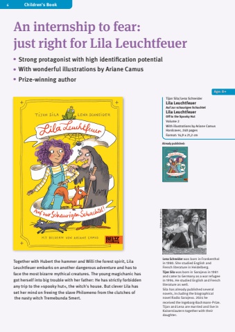 Children's Book %u00a9 Rolando de Sousa6Lena Schneider was born in Frankenthal in 1980. She studied English and French literature in Heidelberg.Tijan Sila was born in Sarajevo in 1981 and came to Germany as a war refugee in 1994. He studied English and French literature as well.Sila has already published several novels, including the biographical novel Radio Sarajevo. 2024 he received the Ingeborg-Bachmann-Prize.Tijan and Lena are married and live in Kaiserslautern together with their daughter.%u25cf Strong protagonist with high identification potential%u25cf With wonderful illustrations by Ariane Camus%u25cf Prize-winning author Together with Hubert the hammer and Willi the forest spirit, Lila Leuchtfeuer embarks on another dangerous adventure and has to face the most bizarre mythical creatures. The young magichanic has got herself into big trouble with her father: He has strictly forbidden any trip to the %u00bbspooky hut%u00ab, the witch's house. But clever Lila has set her mind on freeing the slave Philomeno from the clutches of the nasty witch Tremebunda Smert.Tijan Sila/Lena SchneiderLila LeuchtfeuerAuf zur schaurigen SchachtelLila LeuchtfeuerOff to the Spooky HutVolume 2With illustrations by Ariane CamusHardcover, 240 pagesFormat: 14,9 x 21,2 cmAn internship to fear: just right for Lila LeuchtfeuerAge: 8+Already published: