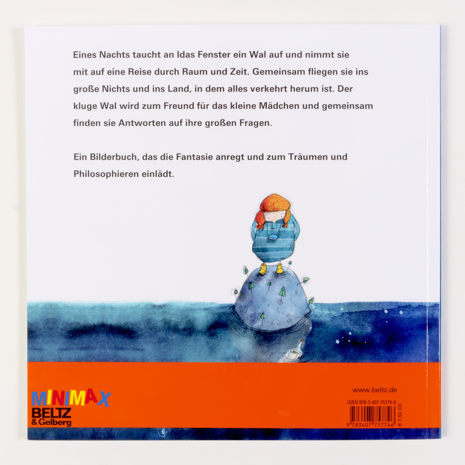 Eines Nachts taucht an Idas Fenster ein fliegender Wal auf, der sie mit auf eine Reise durch Raum und Zeit nimmt. Gemeinsam erkunden sie das Land, in dem alles verkehrt herum ist, und segeln ins große Nichts. Der kluge Wal navigiert, berät und steht Ida bei allen ihren großen Fragen zur Seite – auch dann noch, als er schon wieder verschwunden ist. Ein fantastisches Bilderbuch, das zum Träumen und Philosophieren einlädt.