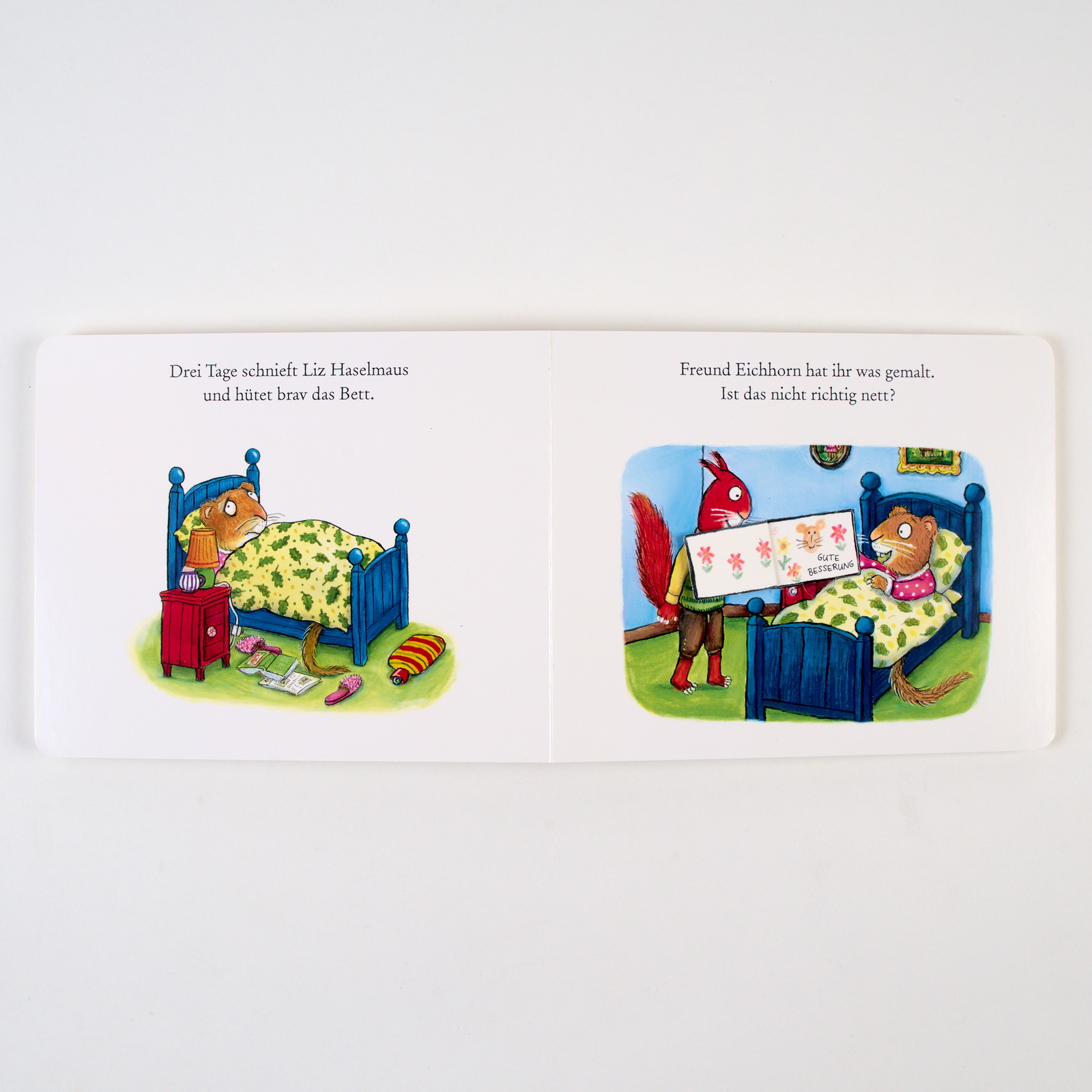 Liz Haselmaus ist krank - die Nase läuft, es kratzt im Hals. Zum Glück helfen die Lutschpastillen von Doktor Wiesel. Aber am Schönsten ist es, wenn alle ihre Freunde sie besuchen. Das Eichhörnchen malt ein Bild, die Amsel kommt mit Trauben. Und was bringen Fuchs und Maulwurf mit? Beim Öffnen der Klappen findet man alle Geschenke!