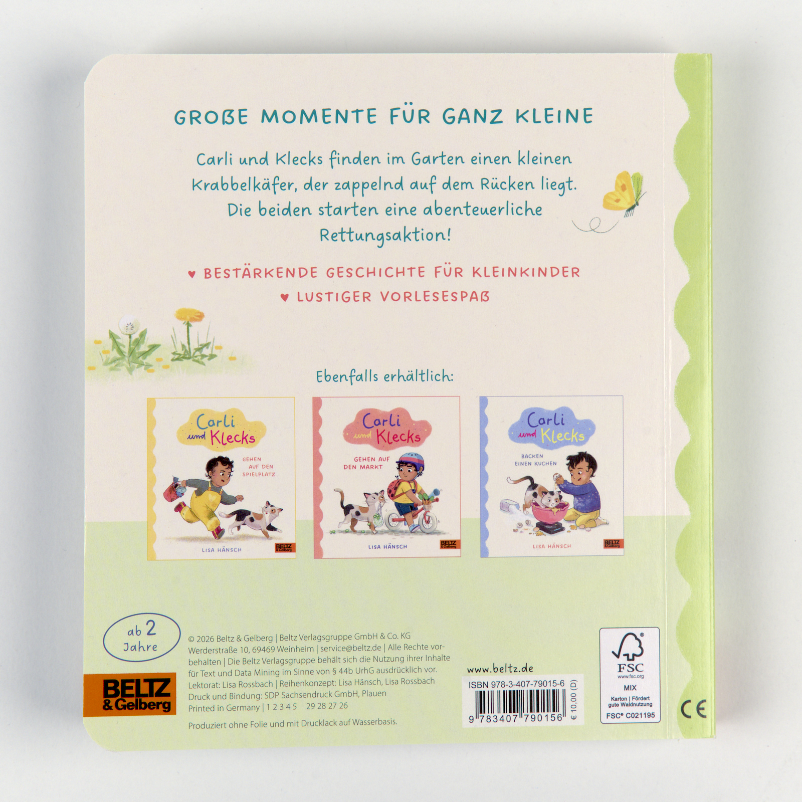 Die Pappbilderbücher von Carli und Kater Klecks ermutigen Kleinkinder, die Welt auf ihre Weise zu erobern. Carli, ein wissbegieriges Kind, und der tiefenentspannte Kater Klecks sind ein liebenswert chaotisches Team mit hohem Identifikationspotential. Die kurzen, lustigen Geschichten aus dem Familienalltag nehmen kleine Kinder ernst und begleiten sie auf dem Weg ihrer Entwicklung ganz frei und voller Zutrauen.