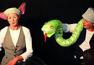 Mit knotigen Knien und schrecklichen Hauern kommt der Grüffelo leibhaftig auf die Bühne! Und er bringt zwei tolle Schauspieler mit, Maike und Stefan von pohyb’s & konsorten, die das furchtbare Monster, die furchtlose Maus und all ihre lustigen Wegbegleiter für Euch zum Leben erwecken: Da brüllt und grunzt der Grüffelo und Maus, Fuchs, Schlange und Eule tanzen und hüpfen nur so umher.