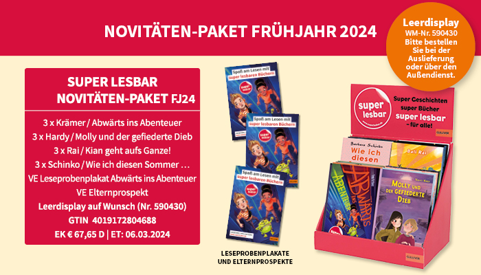 Die Buchhandlung ist ein Ort, an dem täglich aktive Leseförderung stattfindet: nämlich jedes Mal, wenn Sie als Buchhändler:in ein Kind zum Lesen ermutigen. Dies kann unter Umständen jedoch sehr schwierig sein. Oft müssen starke Lesewiderstände durch z.B. Legasthenie oder andere Formen von Leseschwächen überwunden werden. Mit unseren Büchern bei Gulliver möchten wir Sie unterstützen für Kinder das passende Buch zu finden. Dabei orientieren wir uns an den Bedürfnissen der Kinder. Die Geschichten spielen in der Lebenswelt der Kinder und sind sprachlich an die jeweilige Lesekompetenz angepasst. Finden Sie im Folgenden die Vielfalt unseres Programms und lassen Sie uns gemeinsam die Lesefreude der Kinder neu entfachen.