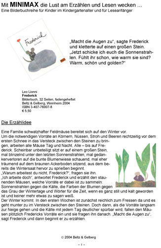 "Macht die Augen zu", sagte Frederick und kletterte auf einen großen Stein. "Jetzt schicke ich euch die Sonnenstrahlen. Fühlt ihr schon, wie warm sie sind? Schön warm und golden."